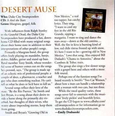 3. The New Mexico Magazine reviewed our second CD, Drained and Unplugged, in January 2008. Here are some excerpts, “Tony Smith, however, still writes the cleverest songs….Bill Dufault’s “East Canyon Winds” skillfully details his journey west from Massachusetts to New Mexico. Aaron Combs provides great fiddlin’ throughout, and Jon Bryan’s fine banjo pickin’ punctuates his toe-tapping “Swampcooler Breakdown.” His “Time Enough for Love” is a poignant end for this cozy, down-home recording.”